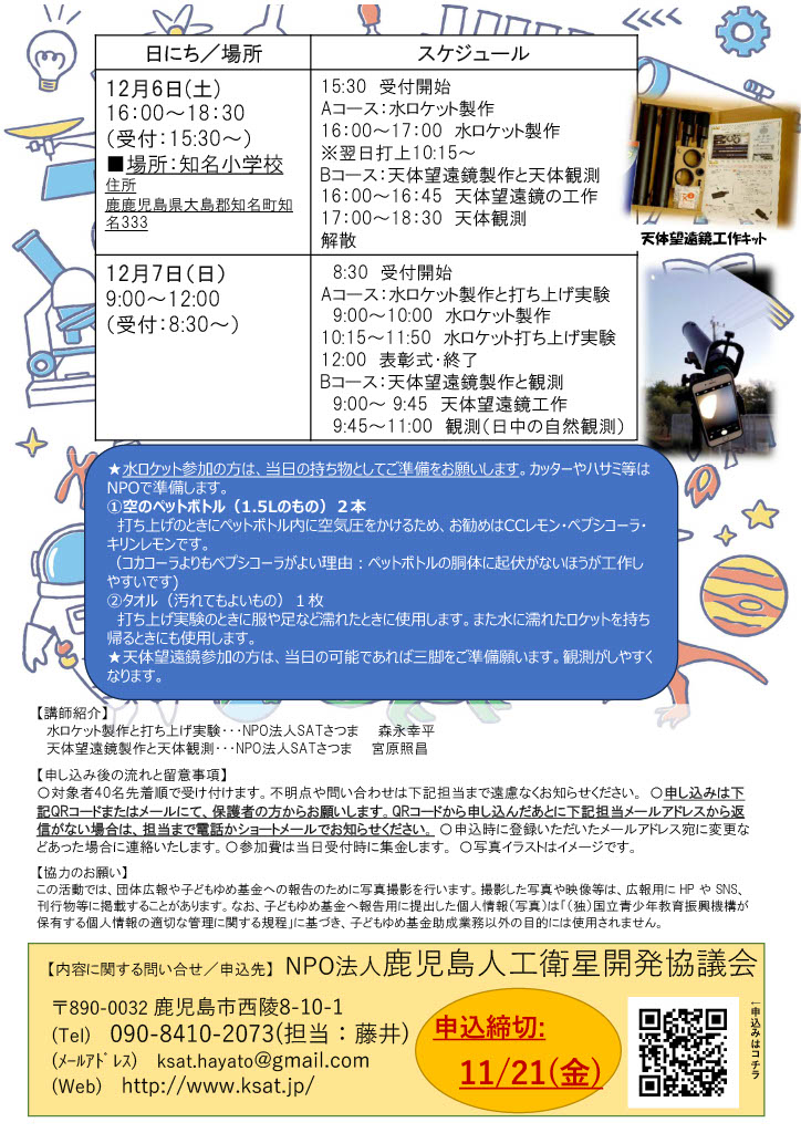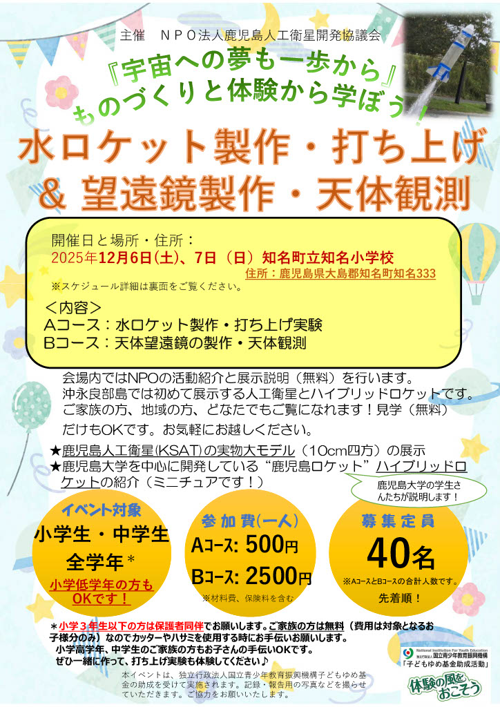 和泊町、知名町の小中学生の皆さん、一緒に水ロケット、天体望遠鏡を製作して科学を楽しみましょう!